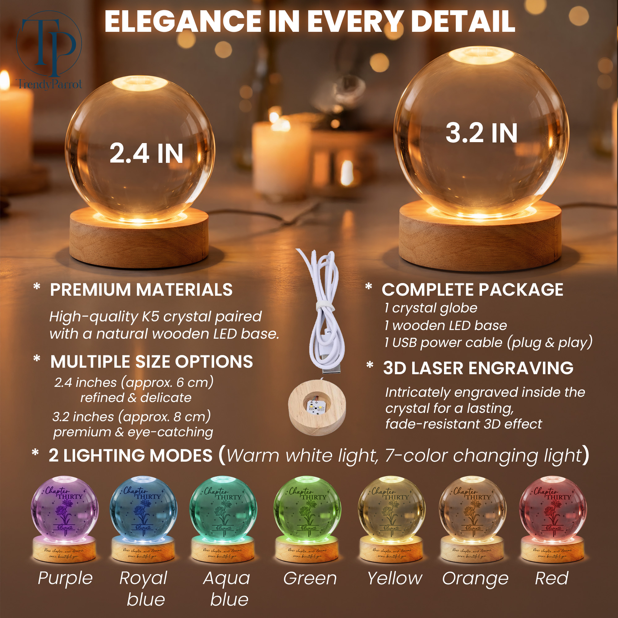 Made from high-quality K5 crystal paired with a natural wooden LED base, offering excellent clarity, durability, and an elegant decorative finish.