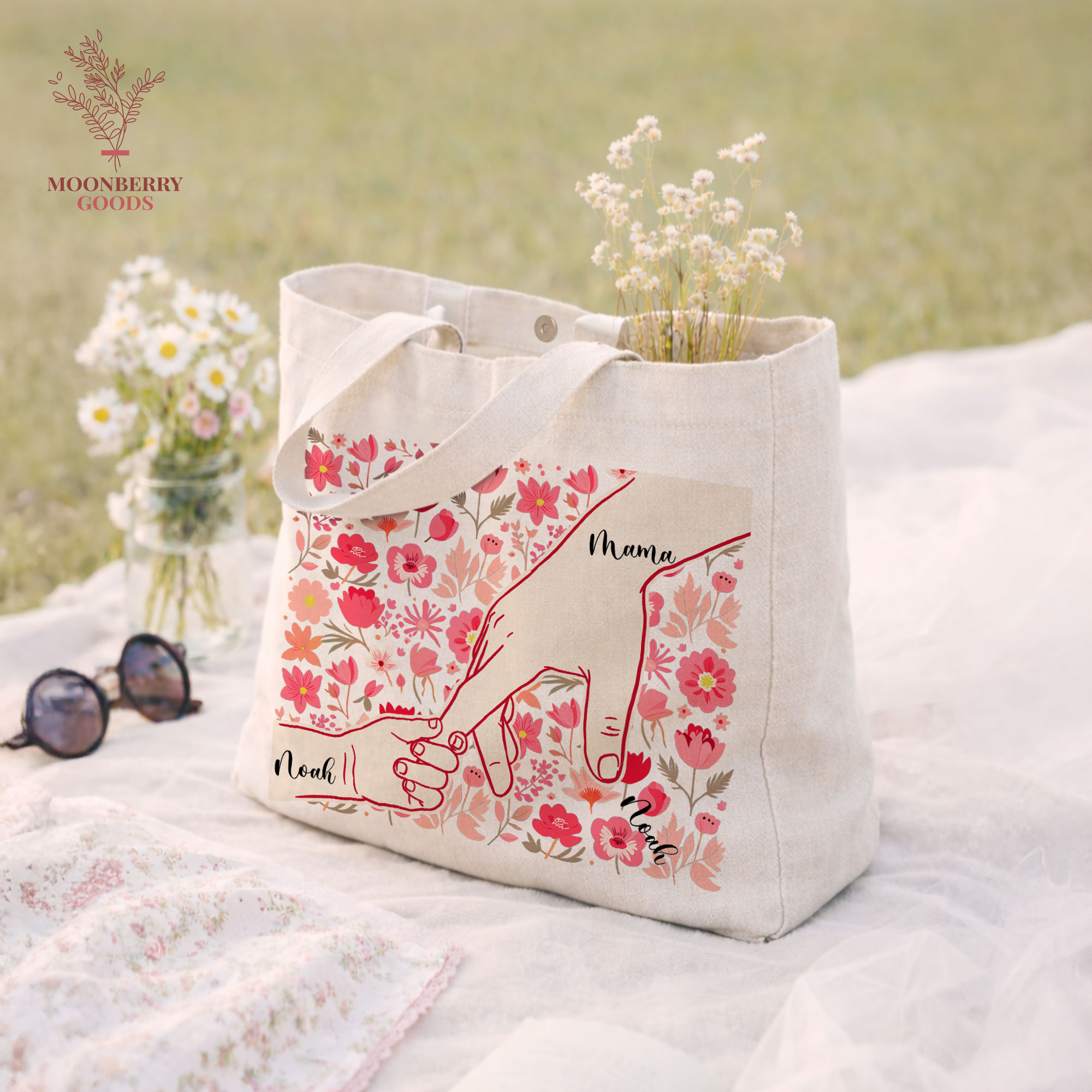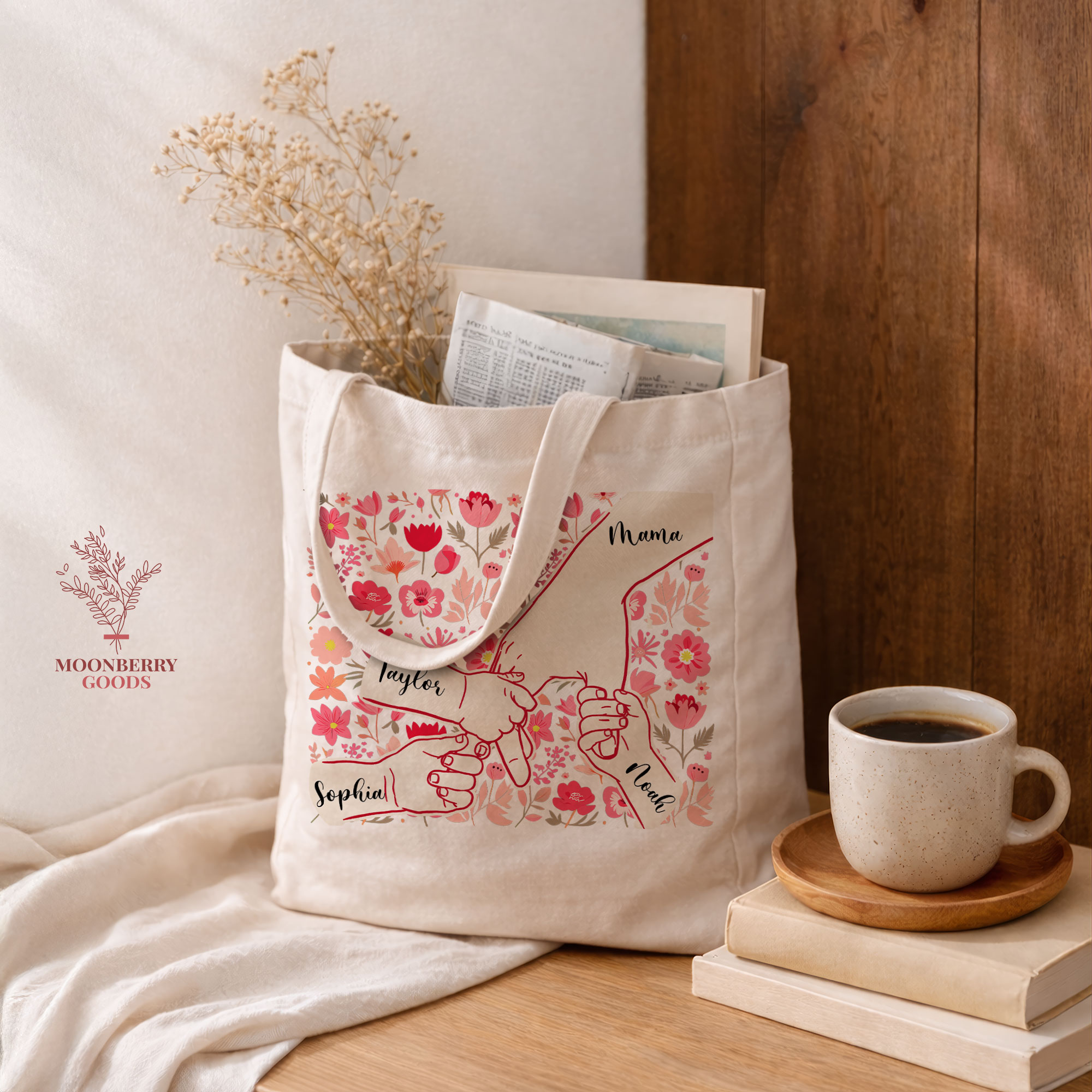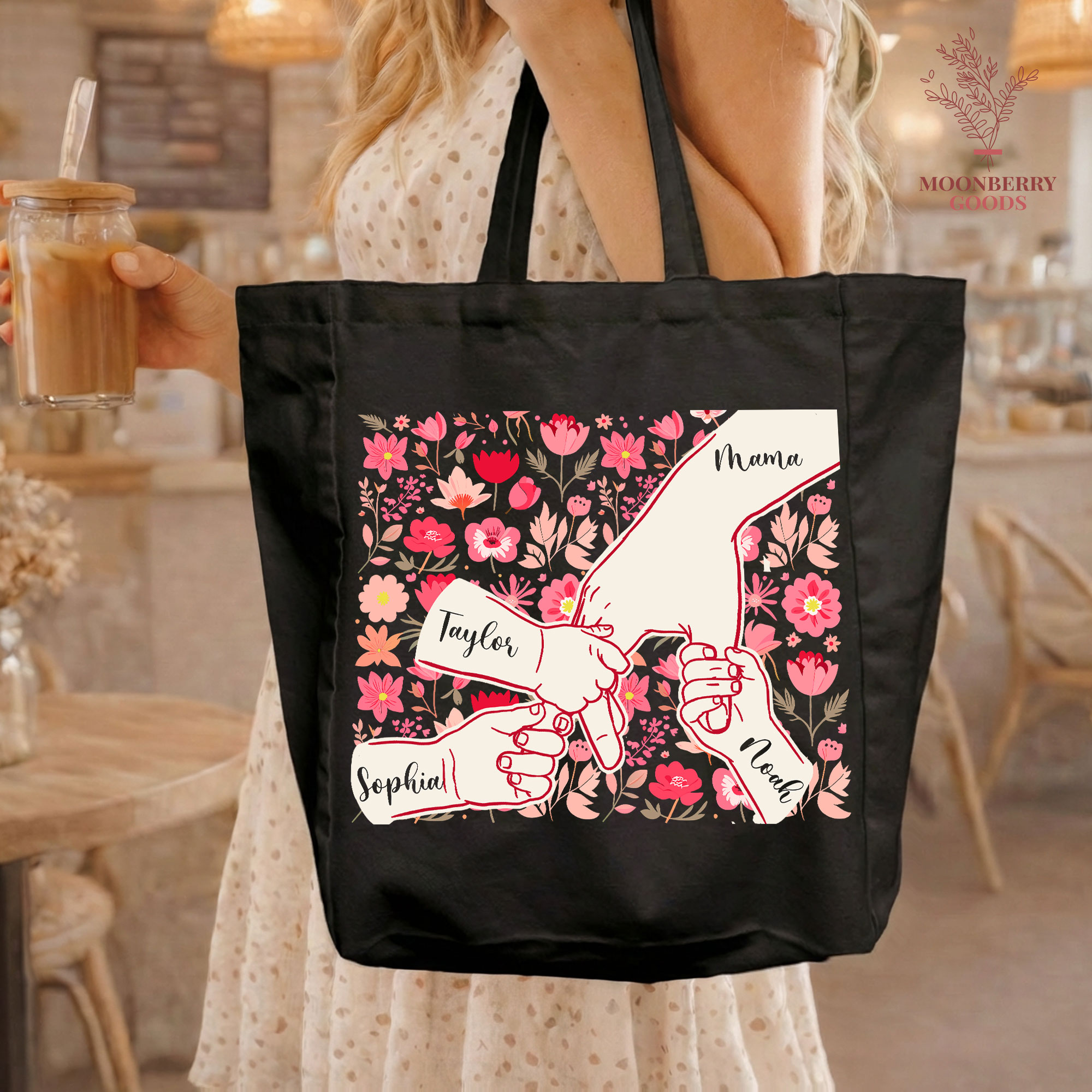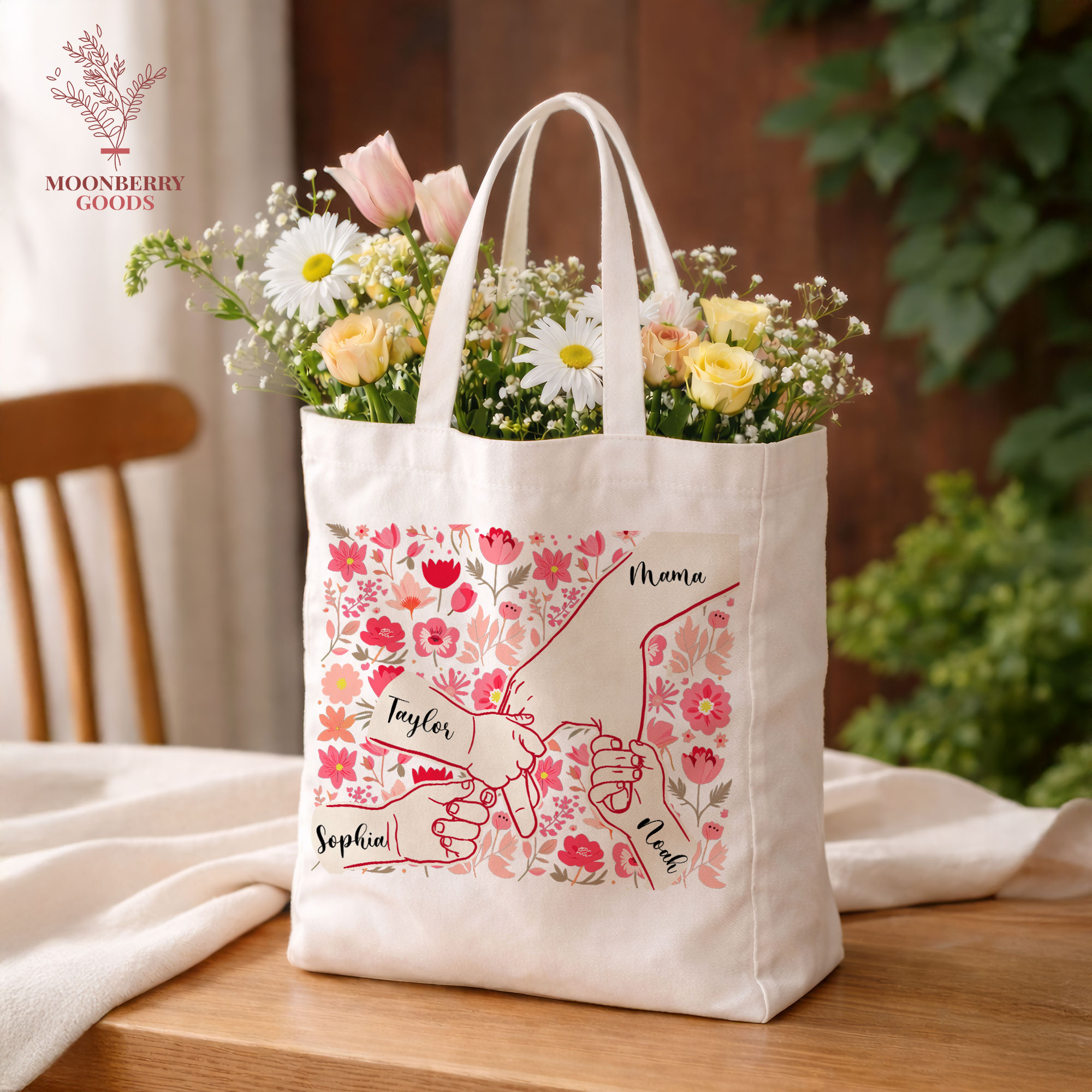 Personalized Holding Mom’s Hand Tote Bag, Custom Mothers Day Gift, Mama Birthday Gifts, Floral Mom Gifts with Kids Names, New Mom Gift