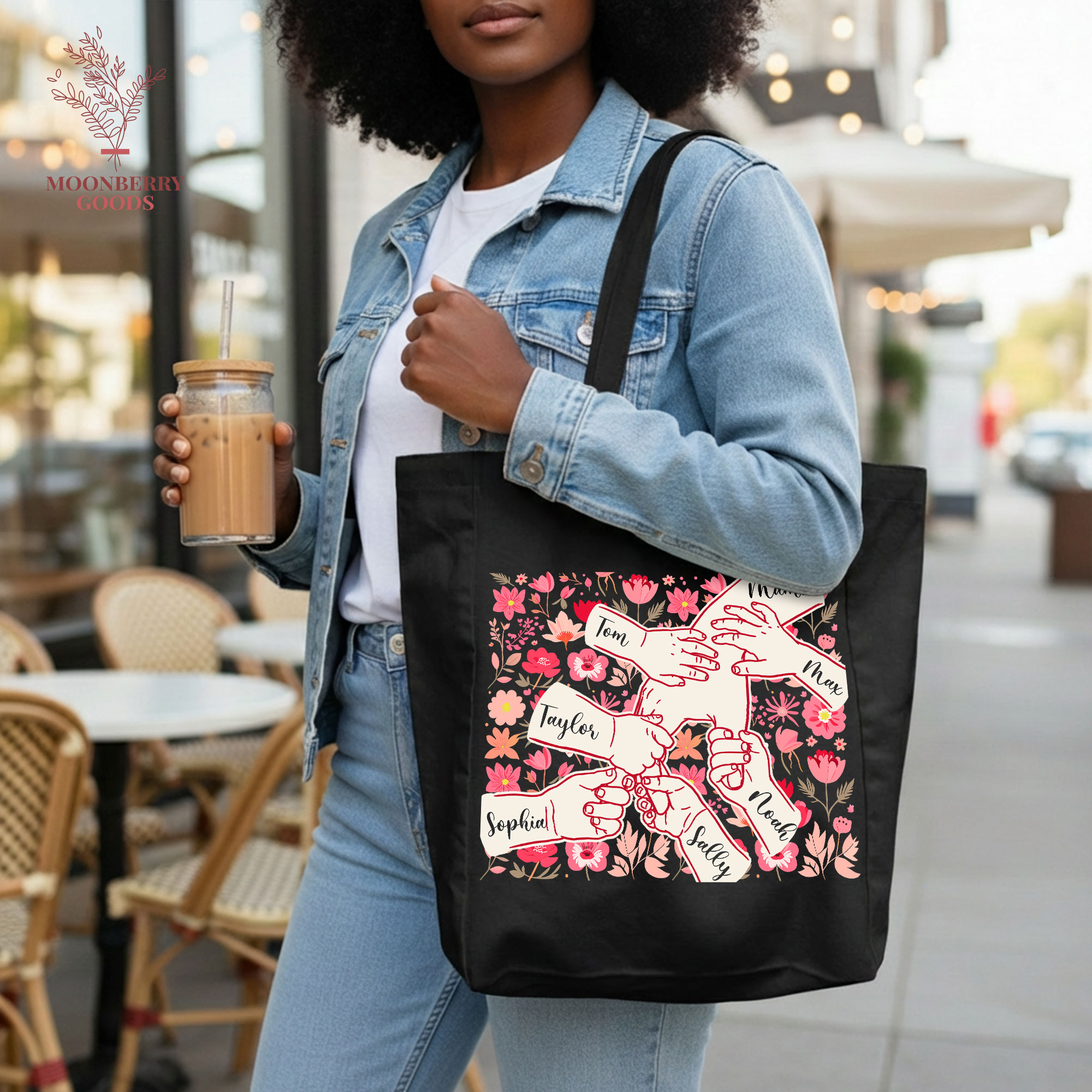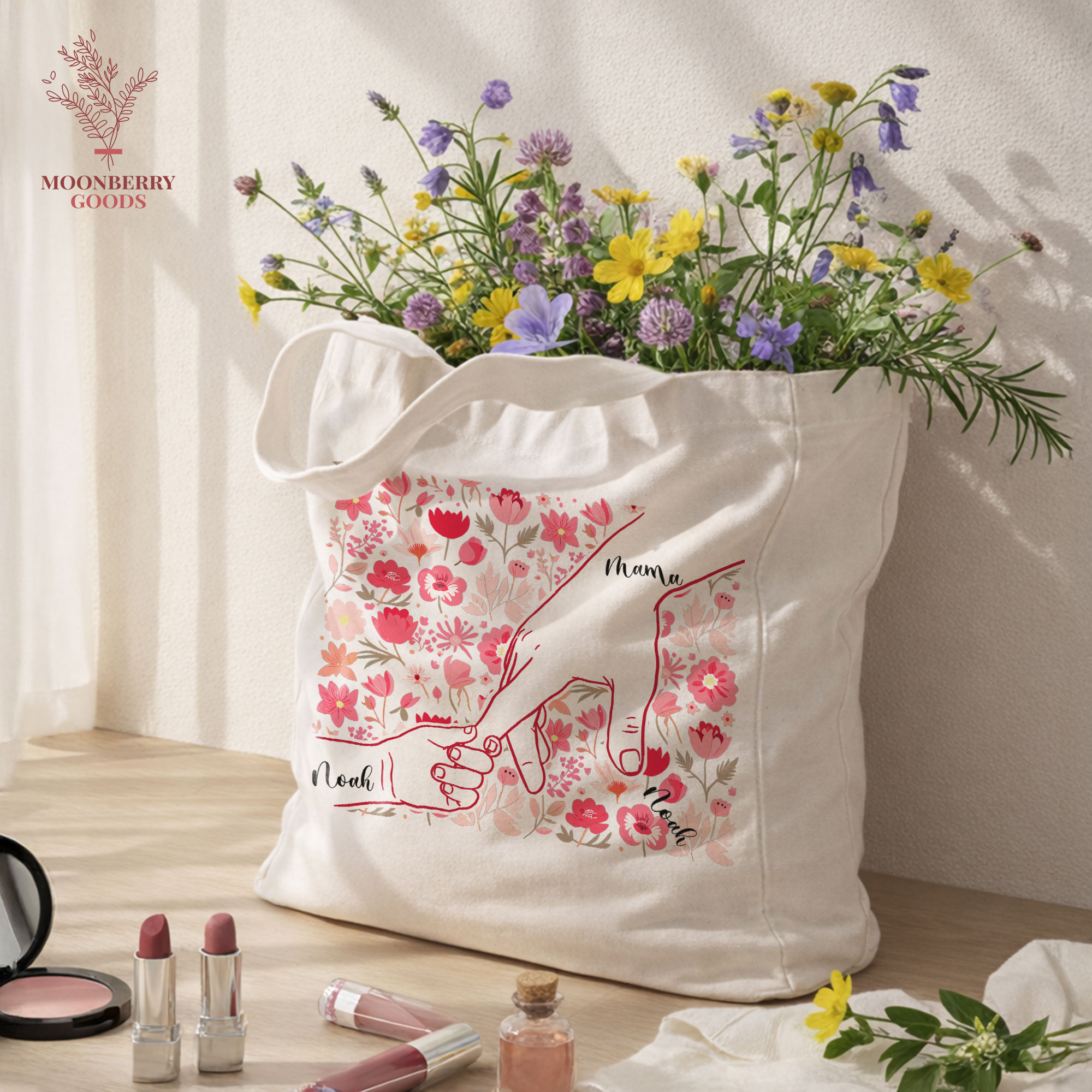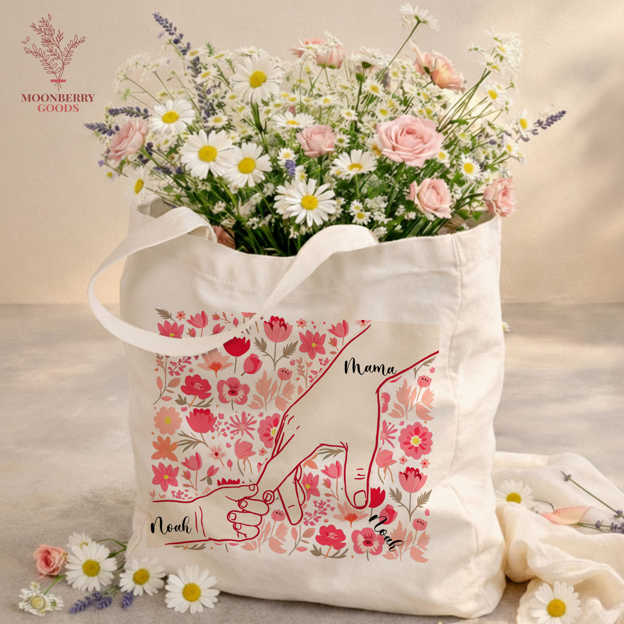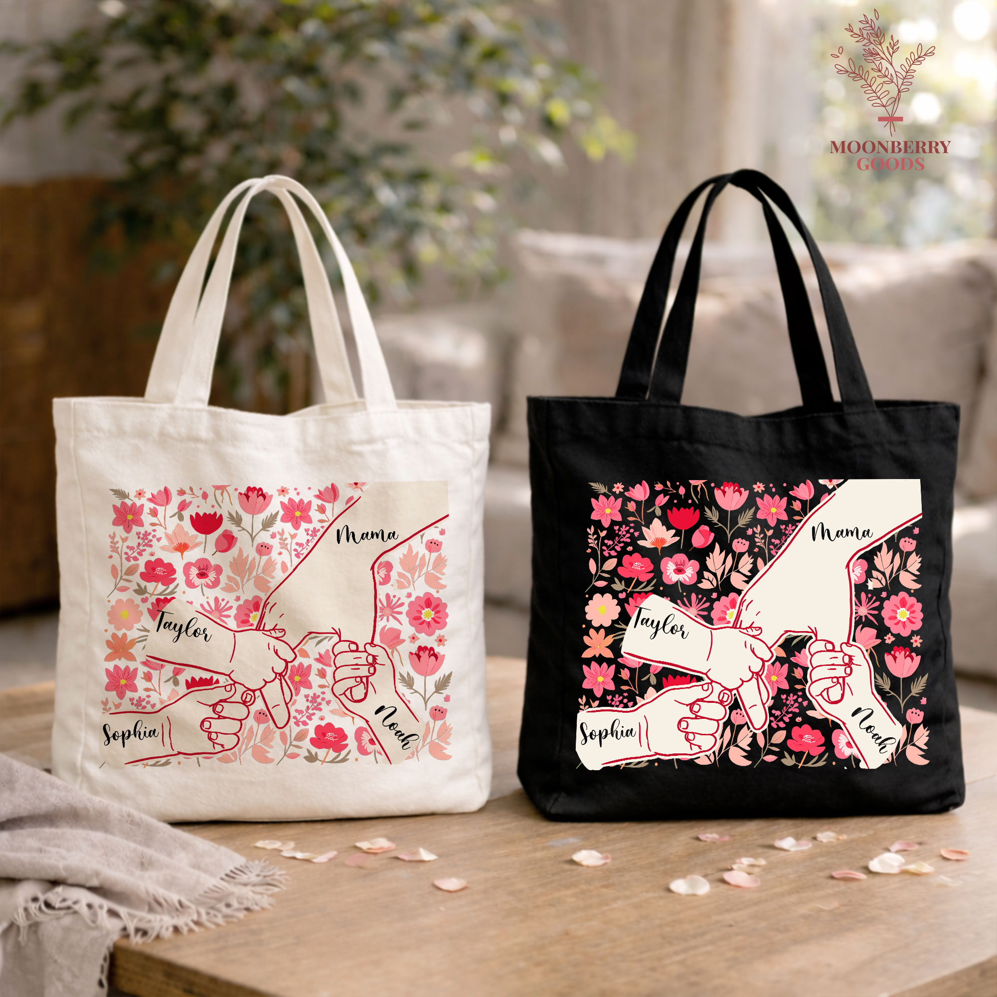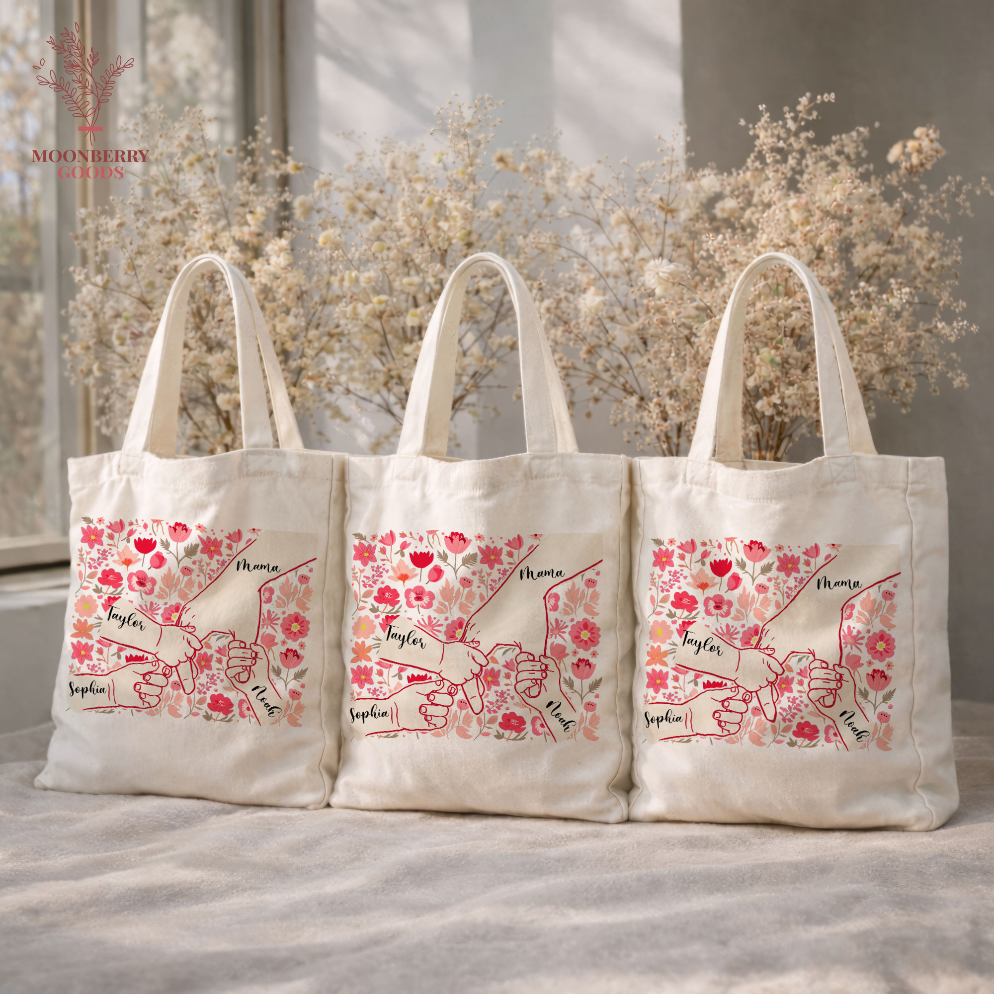 Personalized Holding Mom’s Hand Tote Bag, Custom Mothers Day Gift, Mama Birthday Gifts, Floral Mom Gifts with Kids Names, New Mom Gift