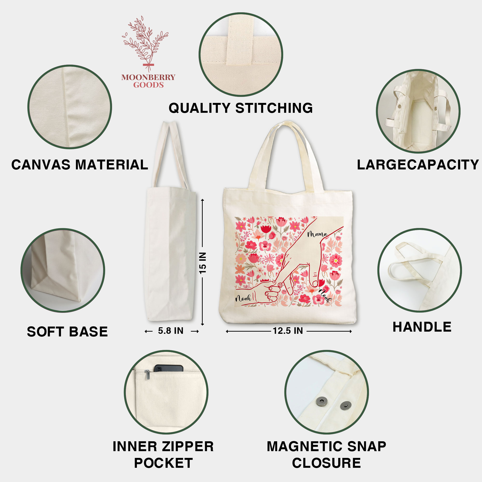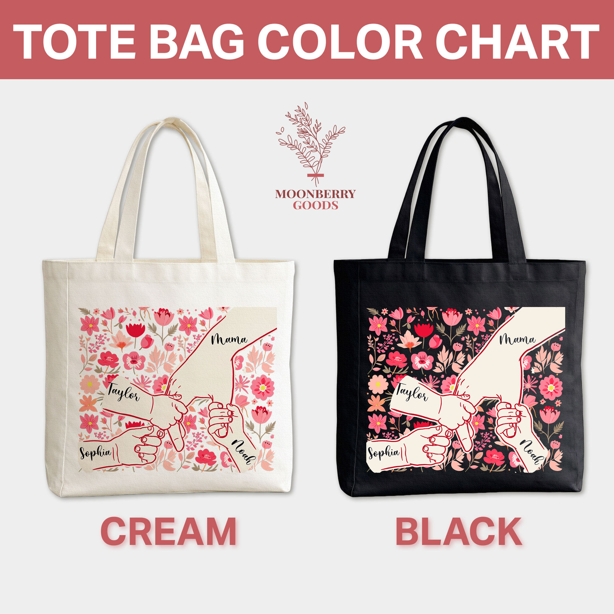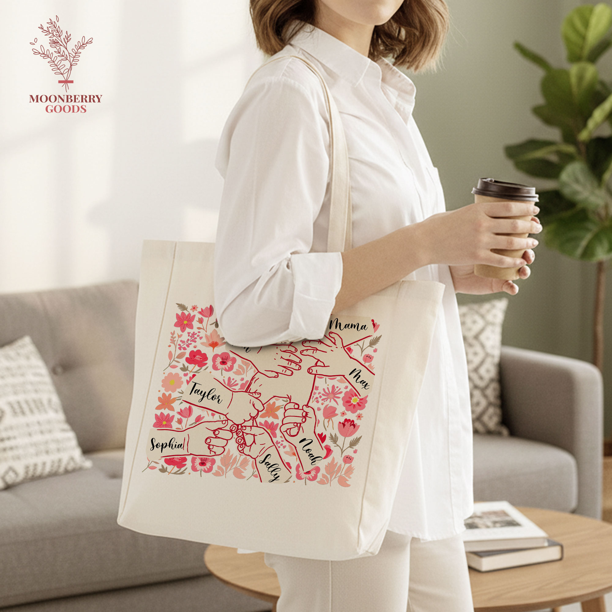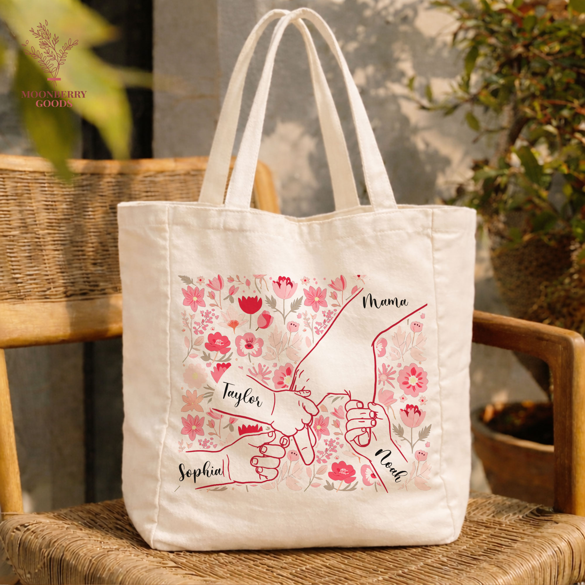 Personalized Holding Mom’s Hand Tote Bag, Custom Mothers Day Gift, Mama Birthday Gifts, Floral Mom Gifts with Kids Names, New Mom Gift